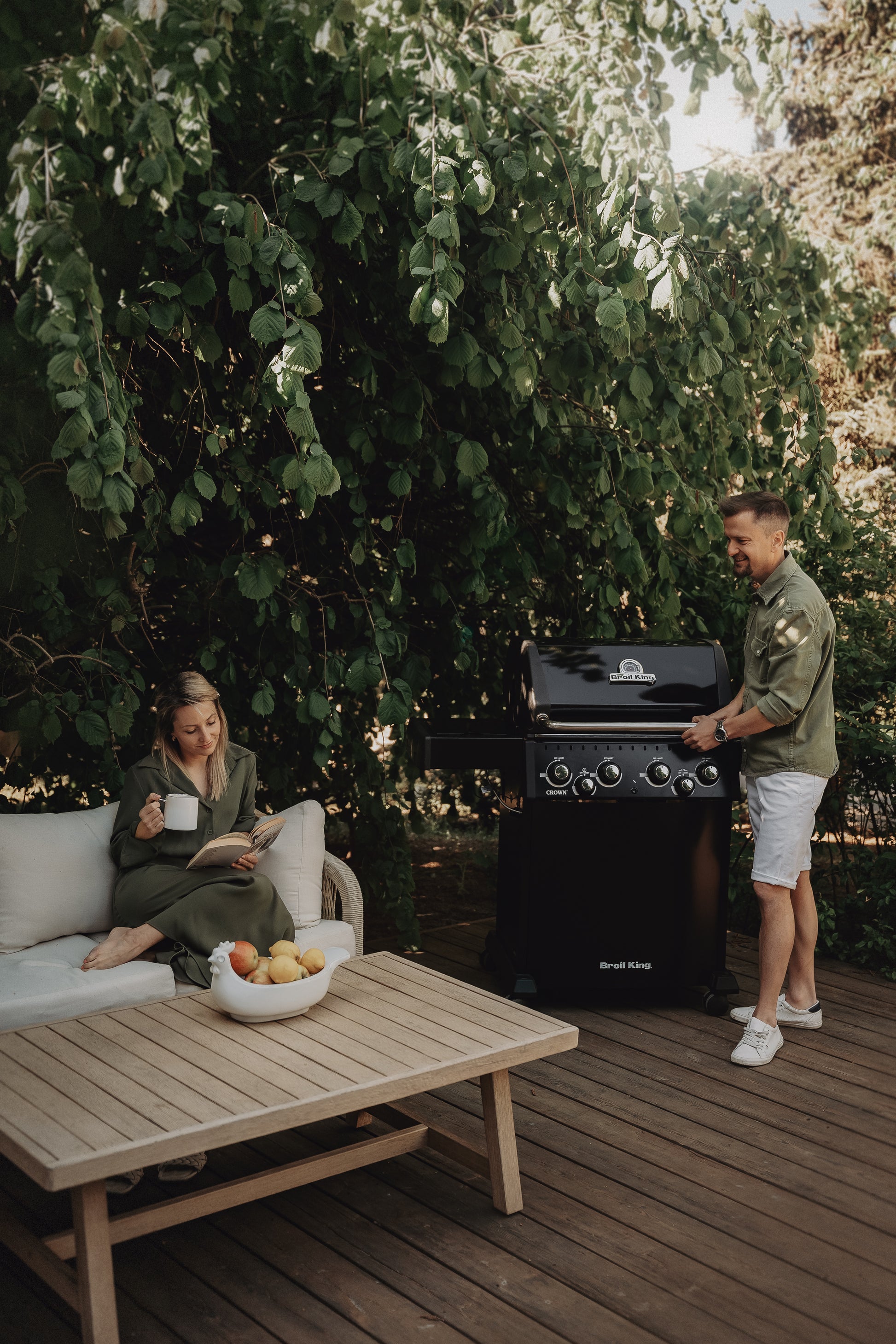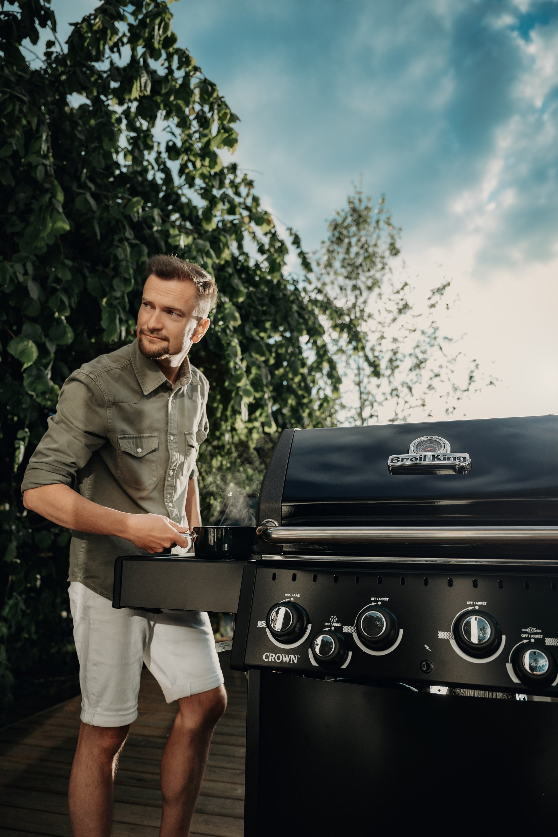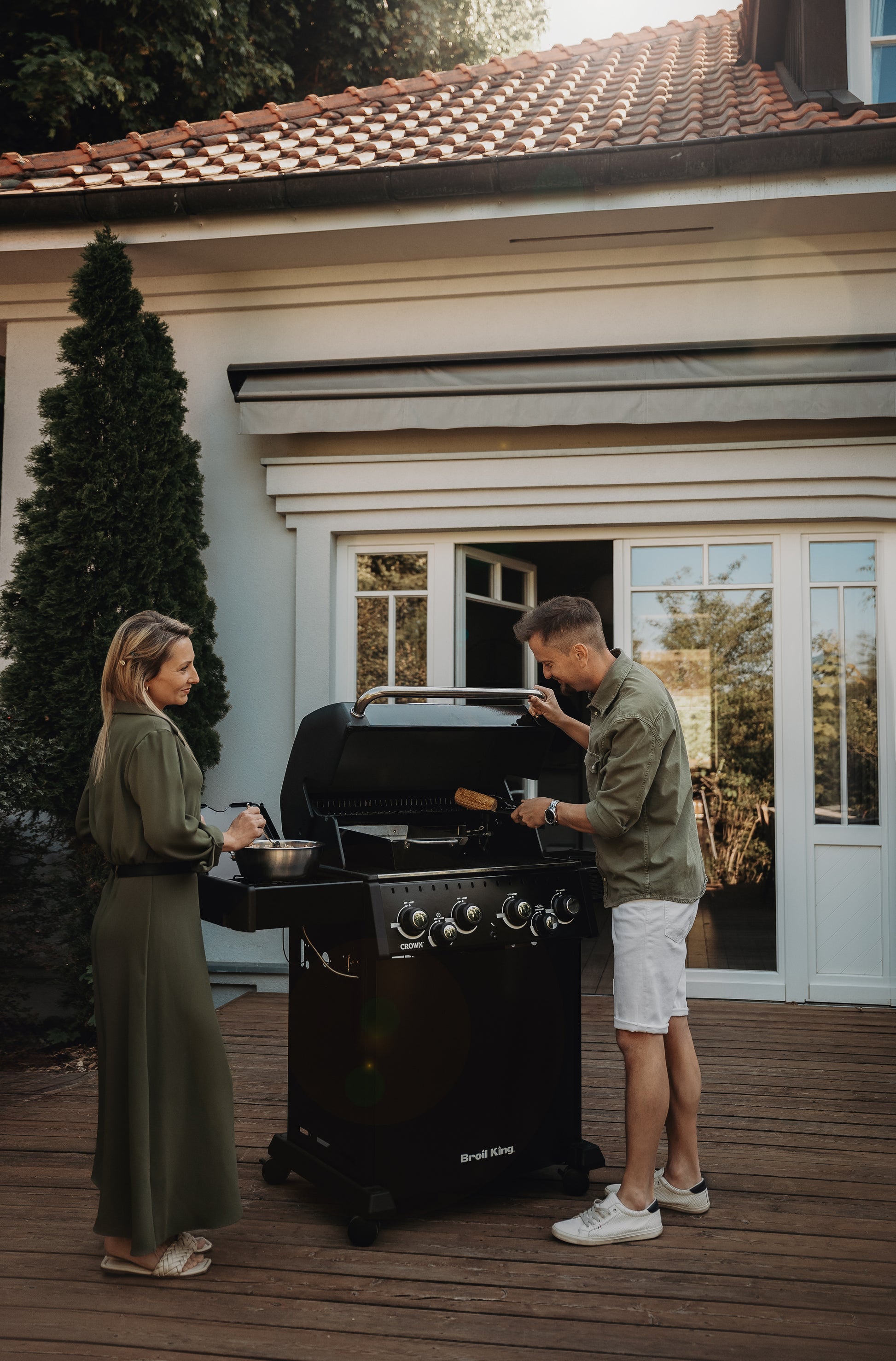 Broil King Crown™ 480 Shadow är gasolgrillen för dig som söker hög prestanda kombinerat med stilren design. Med fyra kraftfulla brännare i rostfritt stål (11,4 kW), en 2,7 kW sidobrännare och en 4,4 kW rotisseribrännare klarar den både vardagsgrillning och festmåltider med imponerande resultat.
