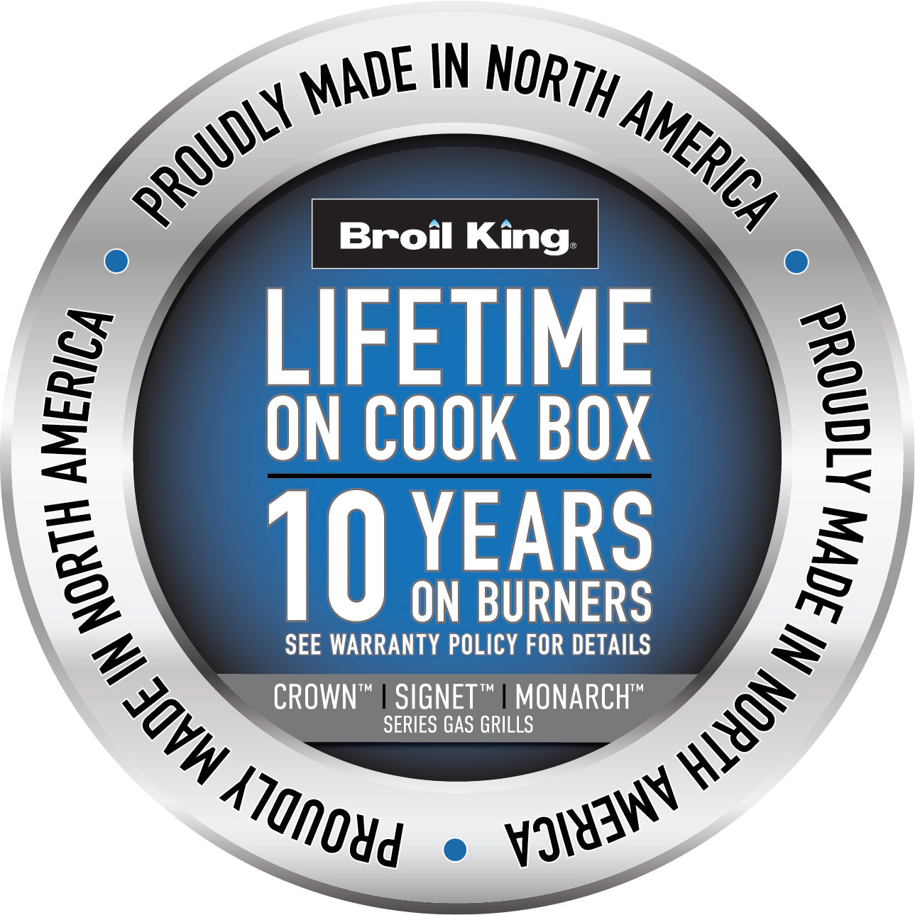 Tillverkad i Nordamerika Som alla Broil King-gasolgrillar är Crown™ 490 stolt tillverkad i Nordamerika med högkvalitativa material för lång livslängd och pålitlig prestanda.