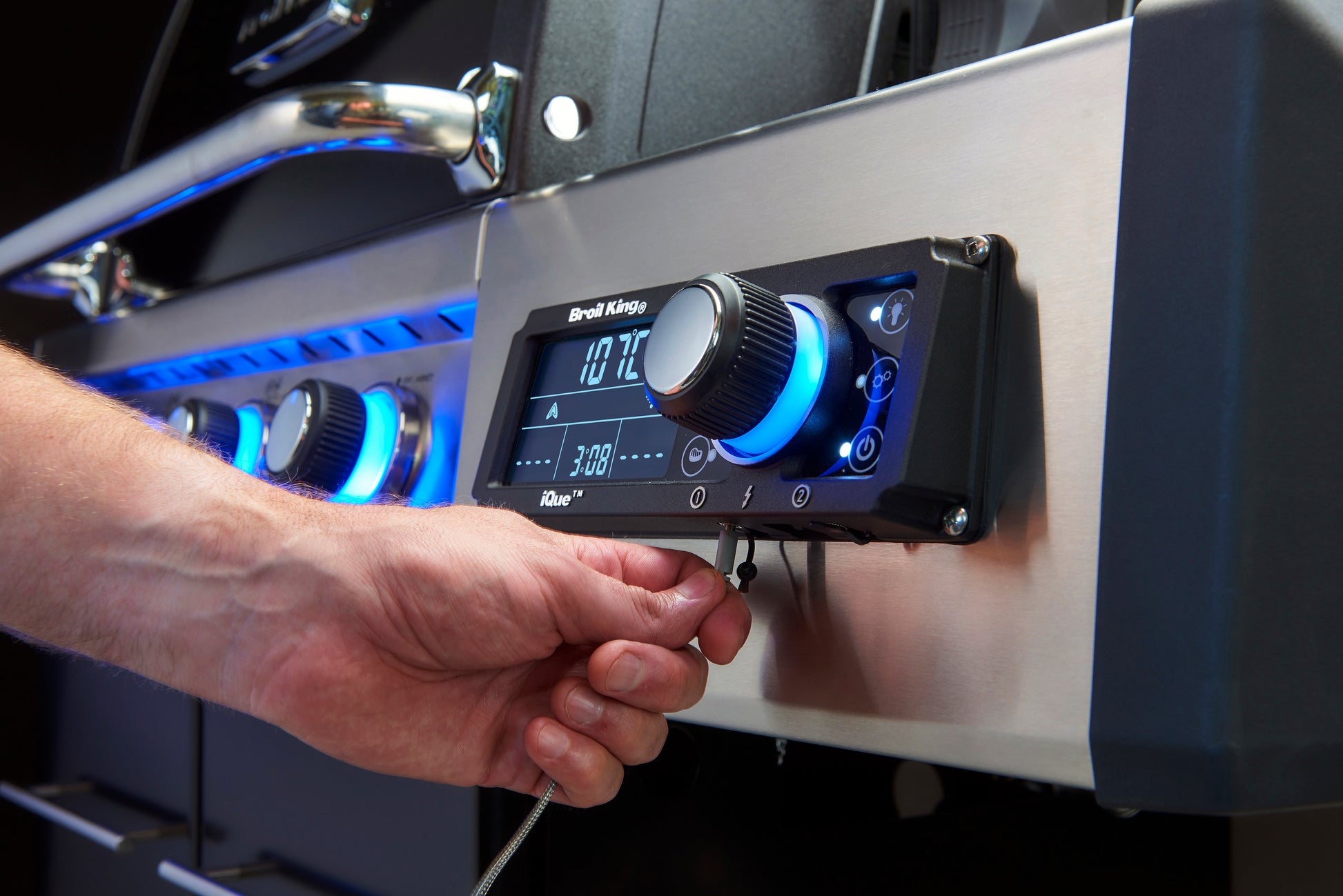 - Patenterad iQue™-teknologi i grillboxen med automatisk tillagningsstyrning, digital temperaturvisning, kontrollvred med LED-belysning och valbar färg, temperaturgivare och timer