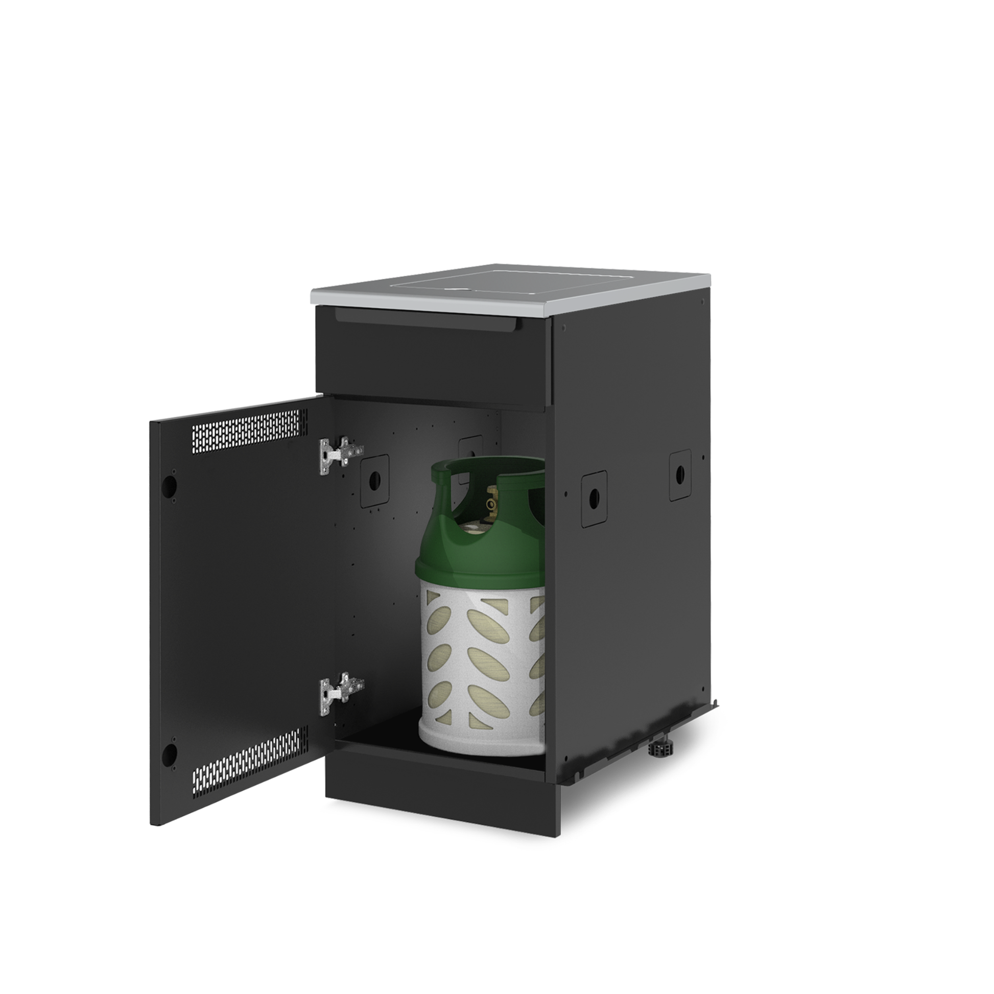 Tillverkat i galvaniserat, svartlackerat stål för extra tålighet och lång livslängd. Den medföljande bänkskivan i rostfritt 430-stål har en utskärning för sidobrännare och ger ett elegant, slitstarkt arbetsutrymme. Underskåpet har en ventilerad dörr för gasolflaska samt en praktisk låda för förvaring av grillredskap och tillbehör.